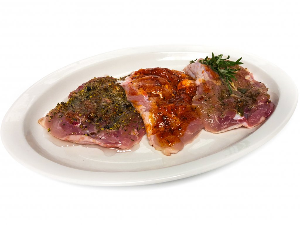 - bylinková marináda: řepkový olej, jedlá sůl (17%), česnek sušený, pepř černý drcený, směs bylinek v různém poměru (tymián, libeček, majoránka, oregano, bazalka) 2,8%, kmín celý, kvasničný extrakt, kari koření, kurkuma mletá, extrakty koření. Může obsahovat stopy hořčice, sóji, lepku, sezamu, celeru a laktózy.
